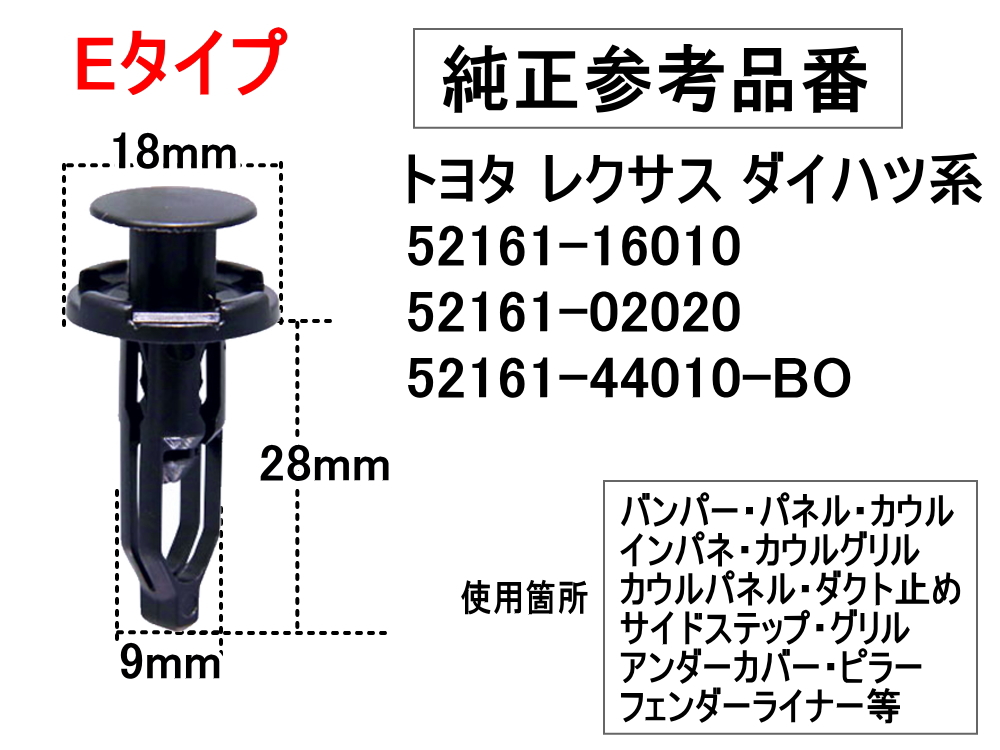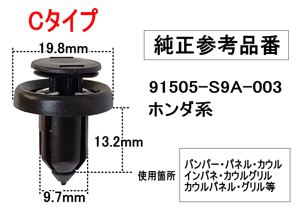 プッシュ式クリップです。 破損しやすいバンパークリップの交換にいかがでしょうか。 内張りクリップ カーファスナー プッシュリベット バンパー・グリル・フェンダーライナー(タイヤハウス) アンダーカバー・サイドプロテクター バンパー・パネル・カウル・インパネ・カウルグリル カウルパネル・ダクト止め・サイドステップ・グリル・ピラー などに使われております。 全8種類(それぞればら売りも販売しています。) ・Aタイプ 参考純正品番 スズキ 09409-07332 トヨタ 90467-07164 マツダ 9S9AK-07332 ニッサン 74999-4A0A3 ミツビシ MC933388 ・Bタイプ 参考純正品番 日産 01553-09321 トヨタ 90044-68320 スズキ 09409-08333 三菱 MR328954 MQ500337 マツダ 9S9AK-08333 ・Cタイプ 参考純正品番 ホンダ 91505-S9A-003 ・Dタイプ 参考純正品番 スズキ 09409-08327 日産 74999-4A0A3 マツダ 9S9AK-08327 トヨタ SU003-02974 スバル 909130132 ミツビシ MQ500336 ・Eタイプ 参考純正品番 トヨタ レクサス ダイハツ系 52161-16010 52161-02020 52161-44010-BO ・Fタイプ 参考純正品番 トヨタ ダイハツ系 90044-67496 ・Gタイプ 参考純正品番 三菱 ミツビシ MR200300 ダイハツ 90044-67577 日産 62098-6A0A1 ・Hタイプ 参考純正品番 スバル 90914-0007 909140007 MR1-30 トヨタ SU003-02984