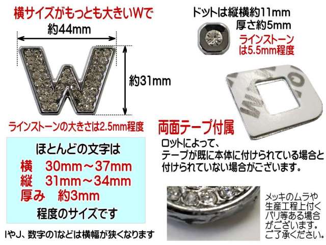 車のみならず、パソコンのカスタムやスマートフォン、 iphone、スマホのカスタム、デコレーションにも使える ラインストーン付きのかわいいジュエリーエンブレムです。 組み合わせ自由のスワロフスキー調エンブレム キラキラ光る、スワロフスキーのような輝きがあり、 愛車を豪華に演出してくれるパーツです。 アルファベット「A~Z 」 数字「0~9」 「ハートマーク」 「.」 上記全38文字 【文字サイズ】 画像を参考にして下さい。 サイズ詳細をお知りになりたい場合は、購入前に必ずお問い合わせ下さい。 材質…ニッケル合金 販売価格は1文字の金額になりますので ご注意下さい。 ※アルファベットは大文字のみになります。 自動車、オートバイ問わず、チーム名や車種名等の オリジナルエンブレムが作成出来ます。 付属品に両面テープがついておりますが、 ロットによっては既に本体に貼付されている場合がございます。 予めご了承くださいませ。 箱、説明書、保証書は有りません。 新品ですが、製造過程・輸送時・保管時等 についたと思われる若干の小傷や生産工程上起こる離脱跡(バリ)やメッキムラがあります。