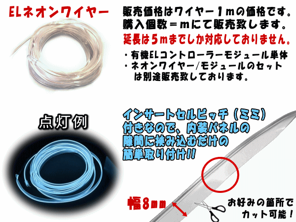 有機ELネオンワイヤー(約1m) 1本 ※発光するにはELコントローラーモジュールが必要です。 また+-を繋いで頂く加工が必要です。