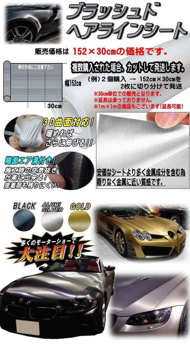 海外モーターショーや国内のオートメッセ等で多くの デモカーが使用しているカッティング可能シートが遂に入荷!! ブラッシュド ヘアラインシート! 鋭く研磨されたメタリックの雰囲気… 曲面に対応した柔軟な素材の為、簡単に高級感のある金属の 質感を演出出来ます。 当店のシートは、安価で販売されている似た商品よりも金属成分を 多く含んでいる為、よりメタルのソリッド感が醸し出されています。 【カラー】 ご購入のカラーは商品名(商品タイトル)記載のカラーです。 全3種類取り扱っております。 シルバー(銀)/ブラック(黒)/ゴールド(金) ※ご購入後のカラー変更は承っておりません。 【サイズ】 ご購入のサイズは商品名(商品タイトル)記載のサイズです。 ●全3種類ございます(幅の変更は出来ません) ・A4サイズ → 幅30cm×20cm ・30cm → 幅152cm×30cm ・大サイズ → 幅152cm×100cm~ (延長可能) 【サイズに関しての注意事項】 ●延長をご希望の場合は、希望の長さ分ご購入下さい。 ※商品画像記載通り30cmサイズは購入個数分、30cmサイズにカットし発送します。 大サイズは1mずつの延長です(最大25mまで) ●長さ10m以上をご希望の方は在庫の有無をお電話にて ご確認下さいますようお願い申し上げます。 ●幅152cmの変更は出来ません。 ※両端1cmは輸送・保管時に付いた折れ目・縮み等がある場合が ございますので実質150cm程度とお考え下さい。 ミニバン/大型車のルーフ、セダン等の大型ボンネットも施工可能。 ※セダンのフルラッピングで約15m程度必要(あくまで参考です) ドアピラーやフロント/リアバンパー、シフトゲートやドアパネルなど の部分ラッピング、またはフルラッピング是非チャレンジ!! 裏面は糊付きで、施工時空気が抜けやすいよう溝がついています。 ※色/伸び/質感に関する質問が多々御座いますがモニター環境に よって色味が異なったり、感じ方に個人差がございますので 不安な方は別途出品しておりますサンプルセットをご購入の 上、商品をご購入下さいますようお願い申し上げます。 購入後の上記理由での返品はお受けできません。 【予めご了承下さい】 ※在庫保管中、商品の特性上全体2ミリ程度の縮みが起こる場合がございます。 ※裏面,粘着付きですが剥がれ易いところには、スプレー糊 などの併用をお勧め致します。 ※カットは手作業の為、多少の誤差(1cm程)はご了承下さい。 ※貼る箇所によっては車検が通らなくなる可能性がございますので、 公道での使用はお近くの車検場でご確認後施工して下さい。 ※ボンネットやルーフなど、直射日光や雨水などかかる所での ご使用は変色、色あせの原因となります。 商品の仕様上起こりうる症状ですのでご了承下さい。 ※モニター環境等により実物と若干色味に違いがある場合がございます。 ※施工は専門業者に依頼することをお勧めいたします。 ハイエース、バイク、BMW、ワゴンR、ジムニー アルファード等 あらゆる車種に使用できます。 BBS/SR400/NSR50/GPZ900Rなど