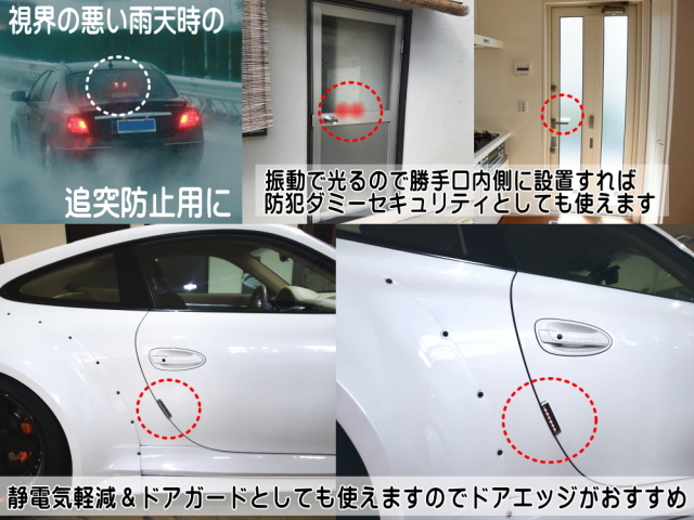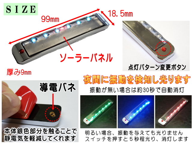 LED警告灯 静電気除去 ソーラーパネル搭載 RGB点滅 感光センサー 振動検知 ワーニングランプ ストロボフラッシュ 太陽光充電 配線不要 車 バイク 後続車 夜間 追突防止 衝突 事故対策 ダミーセキュリティ 勝手口 防犯