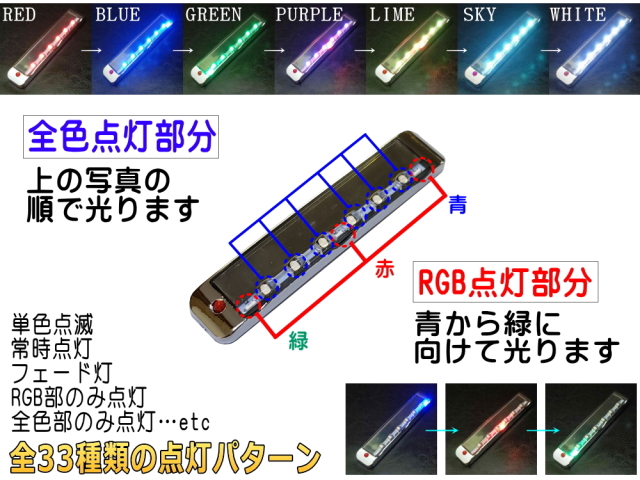 (上記パターンが、赤→青→緑→紫→ライム→水色→白の順で光る、計28パターン)